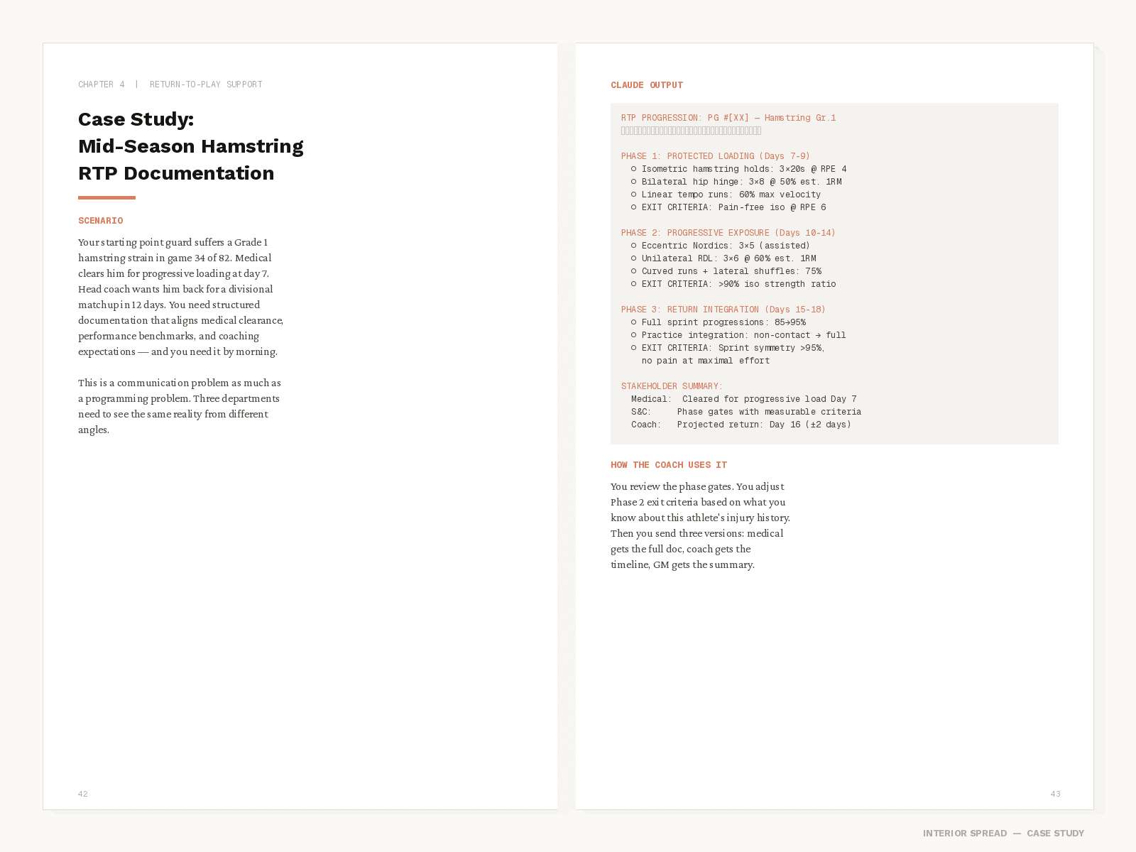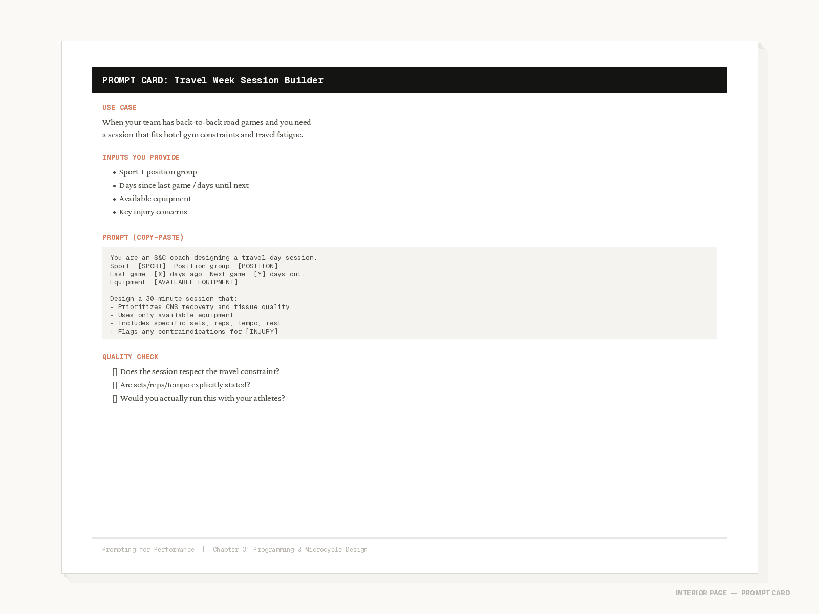 Every prompt is designed around the work you already do — programming microcycles, writing RTP documentation, building SOPs, communicating load management to coaching staff, and running your operation tighter with less admin time.